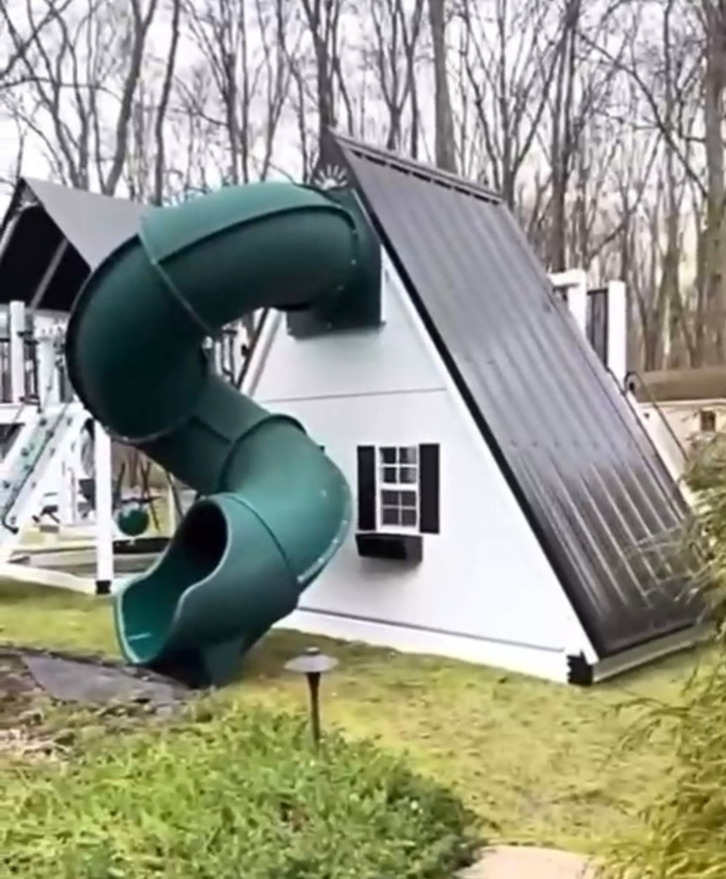 Из домика перекинут подвисной мостик на площадку с горкой и скаладромом.